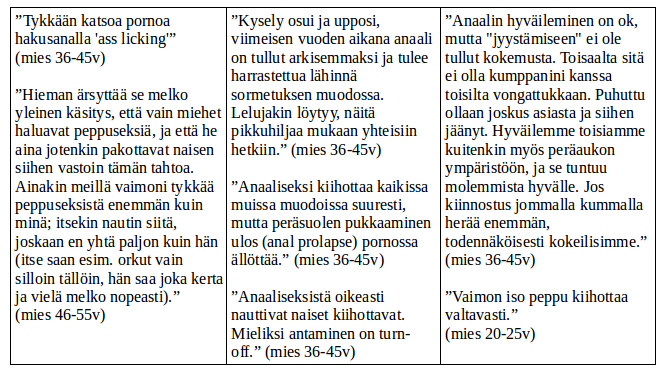 Lisäksi ”vapaa sana” -kohdassa oli muutama yleisluontoisempi kommentti anaaliseksimieltymyksistä. Kaksi sivumainintaa oli myös siihen liittyen, mitä anaaliseksissä koetaan epäkiihottavaksi (toisen mieliksi anaaliseksin antaminen ja ’anal prolapse’).