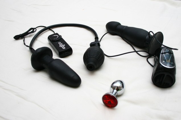 Anaalileluja. Vasemmalta löytyy pumpattava anaalitappi ja oikealta värisevä & edestakaista liikettä tekevä Anal Pusher. Keskellä pieni metallinen anaalitappi.