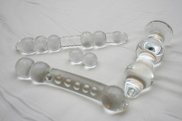 Olen jo aikaisemmin kirjoittanut merkinnän ”Ostaisinko lasisen dildon?”, josta löytyy mietteitäni tarkemmin. Lyhyesti kuitenkin: lasiset lelut eivät omasta mielestäni ole ensisijaisia, jos etsii mukavaa dildoa emättimeen työnneltäväksi. Mutta ei ne pahalta sinnekään työnneltynä tunnu; suosittelen vain lämmittämään lämpimässä vedessä ennen käyttöä. Parhaimpia nämä lelut ovat kuitenkin mielestäni kinkyissä anaalileikeissä. Esimerkiksi LoveHoneysta, Sinful.fi:stä ja Kaalimadosta löytyy kattavat valikoimat erilaisia lasidildoja/lasisia anaalitappeja, jos haluaa lähteä katselemaan, millaisia kaikkia on myynnissä.