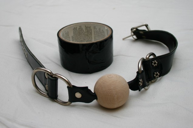 Sitten meillä on vielä yhdenlainen sitomisväline eli bondageteippi. Sitä ei kyllä ole tullut kuin parina kertana kokeiltua, mutta käteväähän se on: ei tartu ihoon eikä vaikka hiuksiin, mutta itseensä siis tarttuu hyvin. Teippirulla maksaa yleensä lähemmäs kympin, esim. Sinful.fi:ssä, Huippukivassa, Antishopissa ja HotLipsissä. Samassa kuvassa näkyy myös suupallo, jota ollaan satunnaisesti käytetty ja jos olisin tämän itse ostanut (mies siis on tämän ostanut joskus), olisin ehkä valinnut muovisen pallon, jotta puhdistaminen sujuisi paremmin. Suupallojen/suukapuloiden kohdallakin valikoimaa riittää, kuten voi huomata esim. LoveHoneyn tai Antishopin valikoimaa selaamalla.