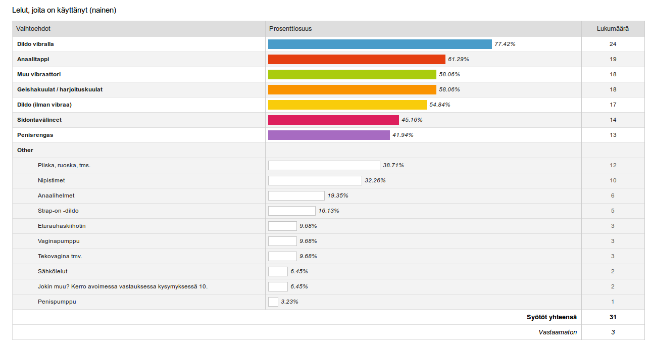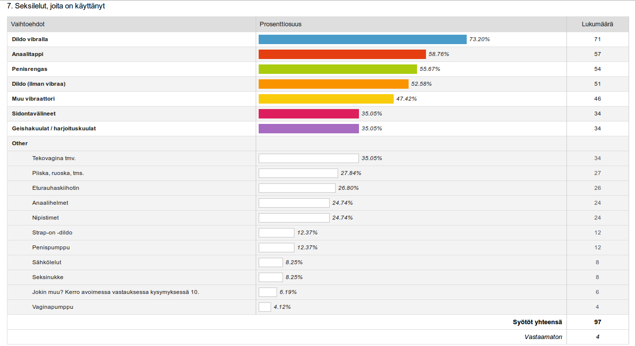 Kuten oli oletettavaakin, yleisimmin vastaajat olivat käyttäneet vibrallista dildoa (73%). Seuraavaksi yleisin oli anaalitappi, jollaista lähes 60% kertoi käyttäneensä. Kolmanneksi yleisin lelu oli penisrengas, jota oli käyttänyt hieman yli puolet vastaajista. Noin puolet kertoi myös käyttäneensä dildoa, josta ei löydy vibraa. Lisäksi lähes puolet kertoi käyttäneensä jonkinlaista muuta vibraattoria.