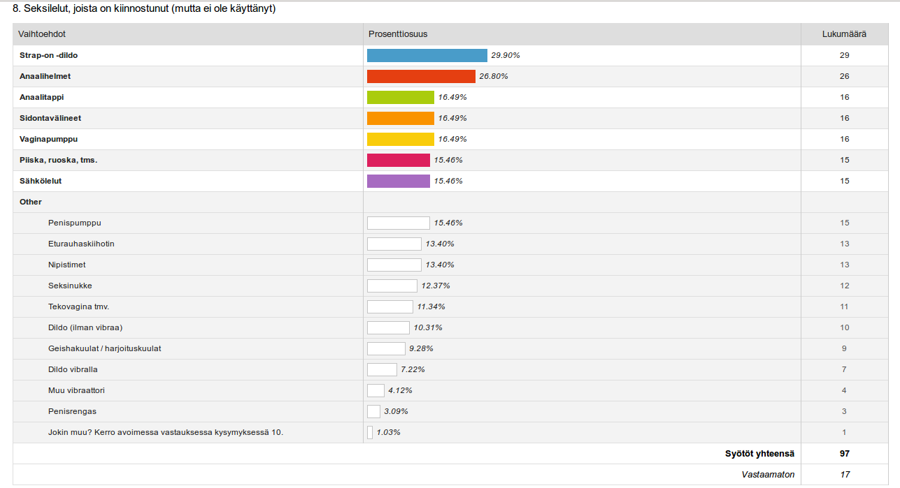 Suurin osa (yli 80%) kyselyyn vastanneista valitsi vähintään yhden välineen, jota olisi kiinnostunut kokeilemaan. Harmillista kyllä, avoimissa vastauksissa kukaan ei kertonut selityksiä sille, miksi kyseiset lelut on jäänyt vielä kokeilematta (raha? kumppani ei ole kiinnostunut?, …).