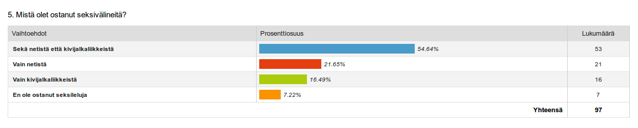 Olin ajatellut, että suurin osa hankkisi seksivälineensä nettikaupoista. Tähän kyselyyn vastanneista kuitenkin yli puolet (54%) oli asioinut sekä netti- että kivijalkaliikkeissä. Vain hieman yli 20% oli ostanut välineitä pelkästään netistä (näin vastanneet olivat useimmiten nuoria henkilöitä). Pelkästään kivijalkaliikkeissä seksileluostoksia oli tehnyt noin 16%.