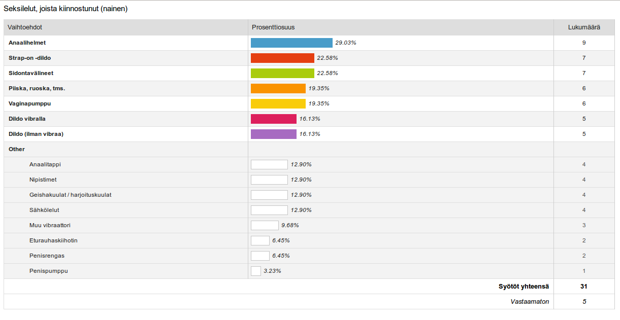 * Jokin muu -kohdassa mainittiin esimerkiksi penisjatkeet ja siveysvyöt.