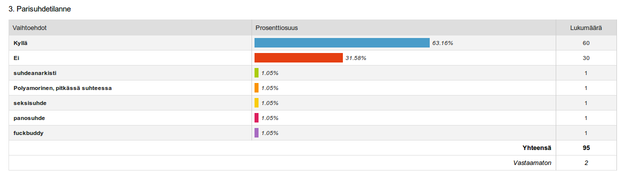 Parisuhde. Kaksi kolmasosaa vastaajista kertoi olevansa tällä hetkellä parisuhteessa. Yksi vastaaja kertoi elävänsä polysuhteessa ja yksi määritteli itsensä ”suhdeanarkistiksi”. Kolme kertoi elävänsä seksisuhteessa tai vastaavassa.