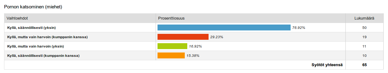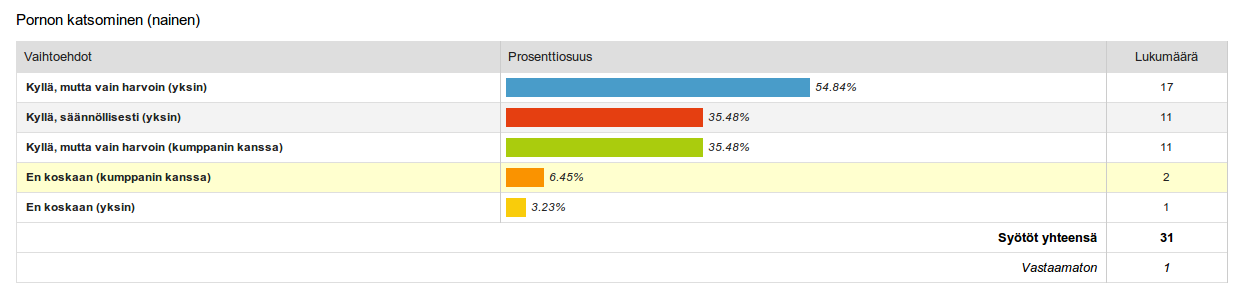 (* Tässä kysymyksessä oli vastausvaihtoehdot asetettu hieman huonosti, joten esim. kaikki parisuhteissa olevat eivät olleet valinneet lainkaan vastausta siihen, katsovatko he pornoa kumppanin kanssa.)