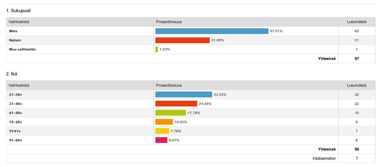 Ikä. Kyselyyn vastanneista kolmasosa oli 21–30-vuotiaita, 31–40-vuotiaita oli 24% ja 15–20-vuotiaita oli 10%. Kaksi kolmasosaa vastaajista oli siis alle 41-vuotiaita. (Katso tarkemmin taulukosta.) Pieni osa vastaajista ei kertonut ikäänsä.