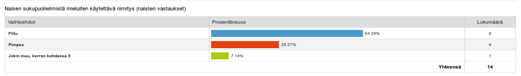 Vastaajia oli melko vähän, joten sattuma voi tehdä paljon, mutta miehillä toiseksi suosituin naisten sukupuolielimistä käytettävä nimitys oli ”pimppi”, kun taas kukaan naisvastaajista ei sitä valinnut.