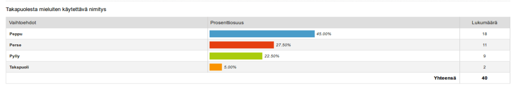 Takapuolesta suosituin nimitys oli ”peppu”. Toiseksi suosituin oli perse ja kolmanneksi suosituin pylly. Jos vastauksia katsoi sukupuolen mukaan, naisilla suosituimmat olivat peppu ja pylly. Miesten vastauksissa peppu ja perse olivat lähes yhtä suosittuja.