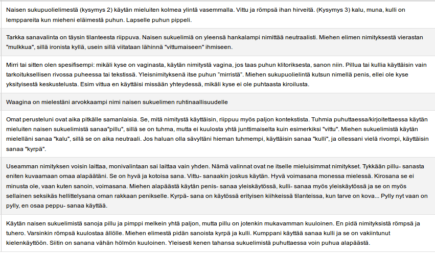 Jokin aika sitten kyselin, mitä nimeä mieluiten lukijamme käyttävät naisen ja miehen sukupuolielimistä. Tähän kyselyyn tuli vain 40 vastausta, kun yleensä kyselyihimme on tullut 100+ vastausta, mutta tällä mennään! Miehiä oli 65% eli 26 vastaajaa. Muita taustatietoja tässä lyhyessä kyselyssä ei tiedusteltu.
